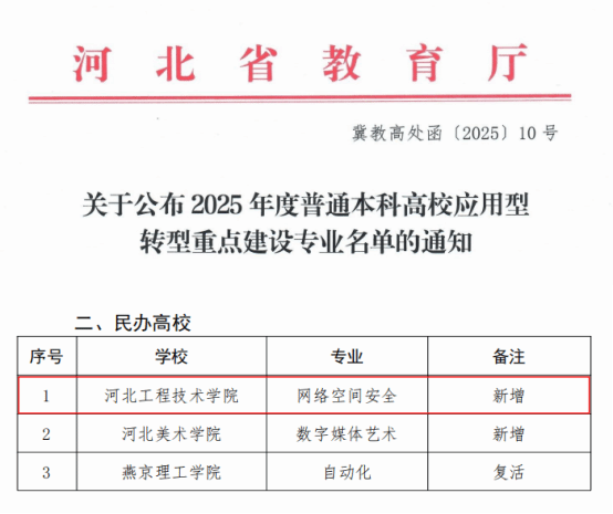 近日,河北省教育厅正式下发《关于公布2025年度普通本科高校应用型转型重点建设专业名单的通知》(冀教高处函〔2025〕10号),我校网络空间安全专业经过严格遴选,成功获批为2025年度河北省普通本科高校应用型转型重点建设专业,标志着我校在应用型人才培养和专业建设方面取得了突破性进展,迈上了新台阶。