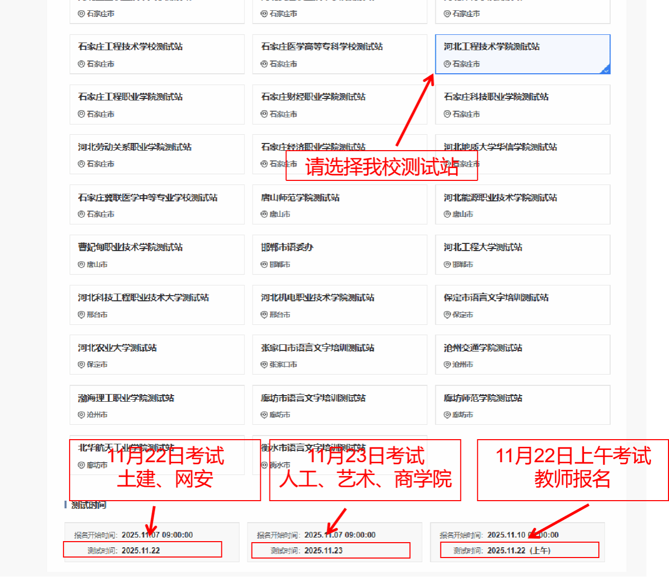 (三)线上报名请注意学校名称,务必选择河北工程技术学院测试站,否则报名无效。