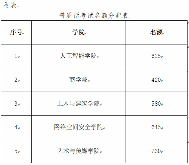 (二)各学院参照附件1普通话考试名额分配表,收集考生信息并填写到考生报名信息表中(见附件2)。贫困生请在表中学生类型一列选择贫困生并填写建档立卡时间,其余考生选择非贫困生。11月6日下午5:00前将考生报名信息表电子版通过OA发送给教务处(教师发展中心)刘帅虎老师。
